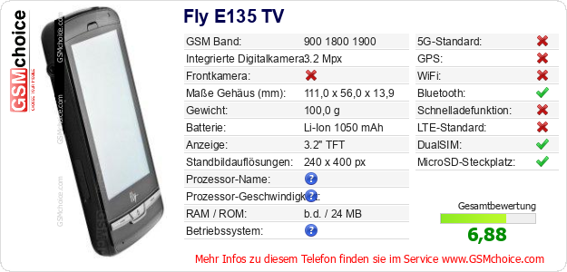 Daten des Mobiltelefons Fly E135 TV auf Ihrer Seite