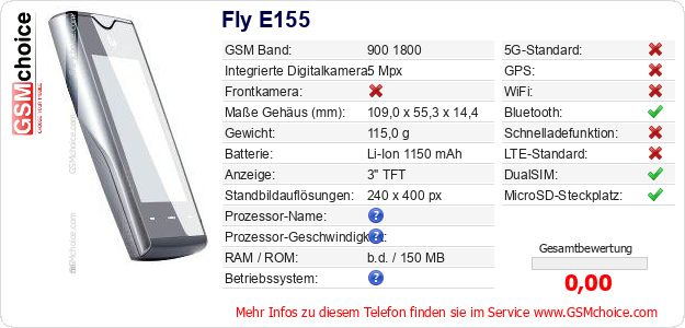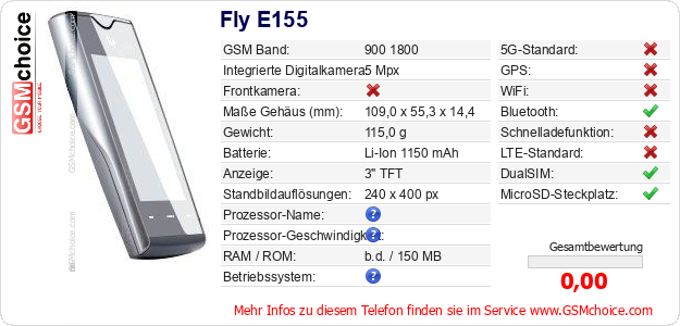 Hast du eigene Webseite? Willst du die Informationen über Standarddaten des Handys Fly E155 irgendwo veröffentlichen? Das ist sehr einfach. Du kannst das Bild herunterladen oder kopieren und auf der Webseite folgenden Code hinzufügen:Das Einfügen von diesem Code verursacht das Anzeigen von dem folgenden Bild: