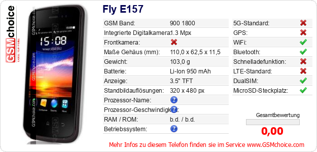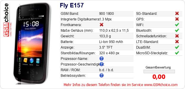 Hast du eigene Webseite? Willst du die Informationen über Standarddaten des Handys Fly E157 irgendwo veröffentlichen? Das ist sehr einfach. Du kannst das Bild herunterladen oder kopieren und auf der Webseite folgenden Code hinzufügen:Das Einfügen von diesem Code verursacht das Anzeigen von dem folgenden Bild: