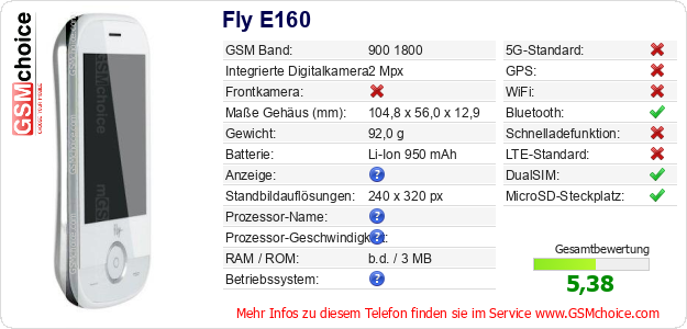 Hast du eigene Webseite? Willst du die Informationen über Standarddaten des Handys Fly E160 irgendwo veröffentlichen? Das ist sehr einfach. Du kannst das Bild herunterladen oder kopieren und auf der Webseite folgenden Code hinzufügen:Das Einfügen von diesem Code verursacht das Anzeigen von dem folgenden Bild: