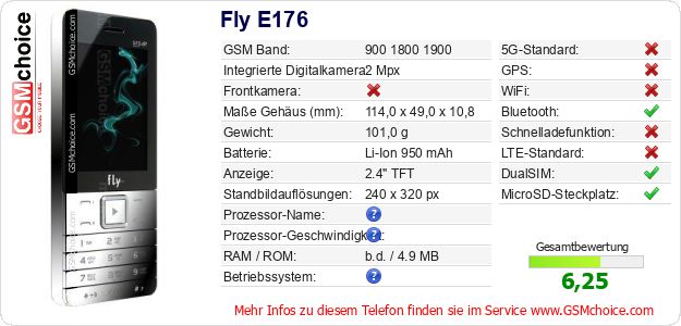 Hast du eigene Webseite? Willst du die Informationen über Standarddaten des Handys Fly E176 irgendwo veröffentlichen? Das ist sehr einfach. Du kannst das Bild herunterladen oder kopieren und auf der Webseite folgenden Code hinzufügen:Das Einfügen von diesem Code verursacht das Anzeigen von dem folgenden Bild: