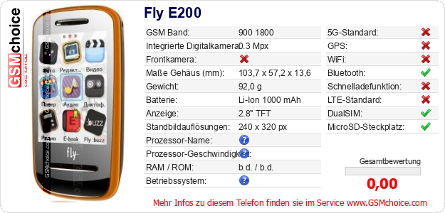 Hast du eigene Webseite? Willst du die Informationen über Standarddaten des Handys Fly E200 irgendwo veröffentlichen? Das ist sehr einfach. Du kannst das Bild herunterladen oder kopieren und auf der Webseite folgenden Code hinzufügen:Das Einfügen von diesem Code verursacht das Anzeigen von dem folgenden Bild: