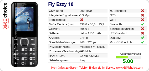 Hast du eigene Webseite? Willst du die Informationen über Standarddaten des Handys Fly Ezzy 10 irgendwo veröffentlichen? Das ist sehr einfach. Du kannst das Bild herunterladen oder kopieren und auf der Webseite folgenden Code hinzufügen:Das Einfügen von diesem Code verursacht das Anzeigen von dem folgenden Bild: