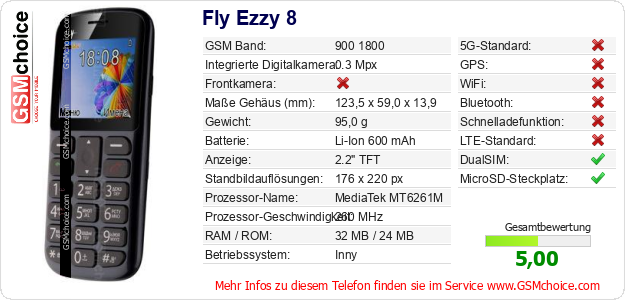 Hast du eigene Webseite? Willst du die Informationen über Standarddaten des Handys Fly Ezzy 8 irgendwo veröffentlichen? Das ist sehr einfach. Du kannst das Bild herunterladen oder kopieren und auf der Webseite folgenden Code hinzufügen:Das Einfügen von diesem Code verursacht das Anzeigen von dem folgenden Bild: