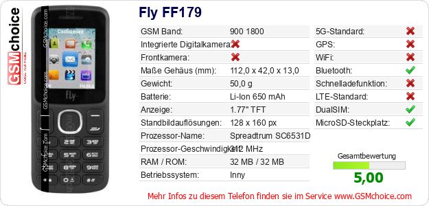Hast du eigene Webseite? Willst du die Informationen über Standarddaten des Handys Fly FF179 irgendwo veröffentlichen? Das ist sehr einfach. Du kannst das Bild herunterladen oder kopieren und auf der Webseite folgenden Code hinzufügen:Das Einfügen von diesem Code verursacht das Anzeigen von dem folgenden Bild: