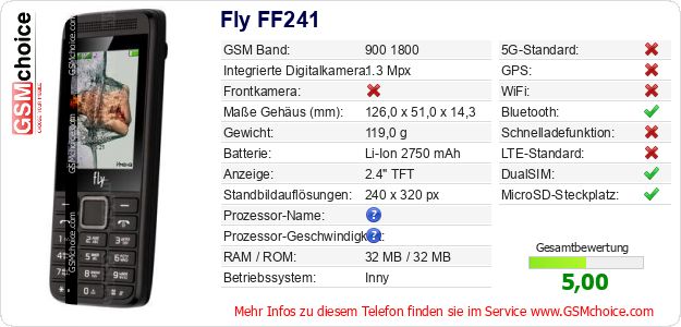 Hast du eigene Webseite? Willst du die Informationen über Standarddaten des Handys Fly FF241 irgendwo veröffentlichen? Das ist sehr einfach. Du kannst das Bild herunterladen oder kopieren und auf der Webseite folgenden Code hinzufügen:Das Einfügen von diesem Code verursacht das Anzeigen von dem folgenden Bild: