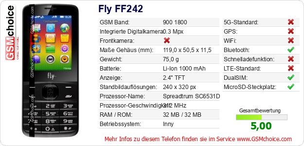 Hast du eigene Webseite? Willst du die Informationen über Standarddaten des Handys Fly FF242 irgendwo veröffentlichen? Das ist sehr einfach. Du kannst das Bild herunterladen oder kopieren und auf der Webseite folgenden Code hinzufügen:Das Einfügen von diesem Code verursacht das Anzeigen von dem folgenden Bild: