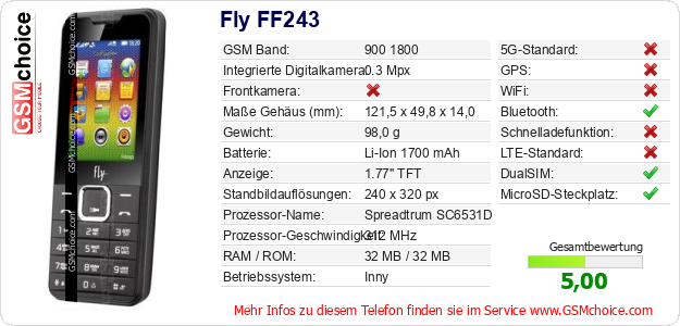 Hast du eigene Webseite? Willst du die Informationen über Standarddaten des Handys Fly FF243 irgendwo veröffentlichen? Das ist sehr einfach. Du kannst das Bild herunterladen oder kopieren und auf der Webseite folgenden Code hinzufügen:Das Einfügen von diesem Code verursacht das Anzeigen von dem folgenden Bild: