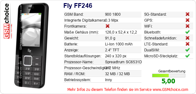 Hast du eigene Webseite? Willst du die Informationen über Standarddaten des Handys Fly FF246 irgendwo veröffentlichen? Das ist sehr einfach. Du kannst das Bild herunterladen oder kopieren und auf der Webseite folgenden Code hinzufügen:Das Einfügen von diesem Code verursacht das Anzeigen von dem folgenden Bild: