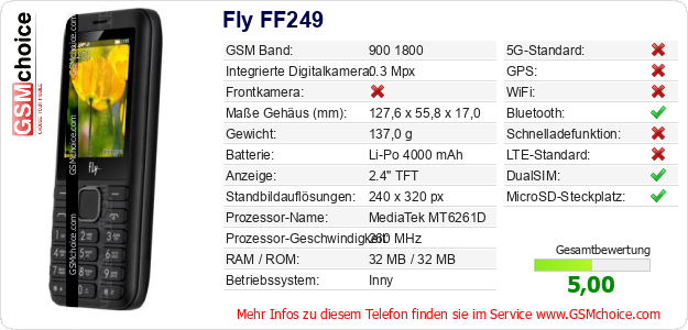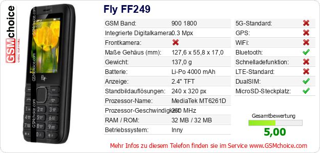Hast du eigene Webseite? Willst du die Informationen über Standarddaten des Handys Fly FF249 irgendwo veröffentlichen? Das ist sehr einfach. Du kannst das Bild herunterladen oder kopieren und auf der Webseite folgenden Code hinzufügen:Das Einfügen von diesem Code verursacht das Anzeigen von dem folgenden Bild: