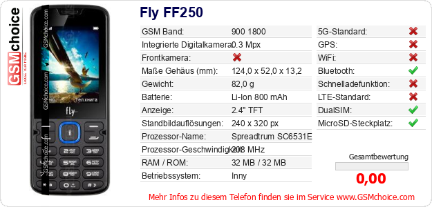 Hast du eigene Webseite? Willst du die Informationen über Standarddaten des Handys Fly FF250 irgendwo veröffentlichen? Das ist sehr einfach. Du kannst das Bild herunterladen oder kopieren und auf der Webseite folgenden Code hinzufügen:Das Einfügen von diesem Code verursacht das Anzeigen von dem folgenden Bild: