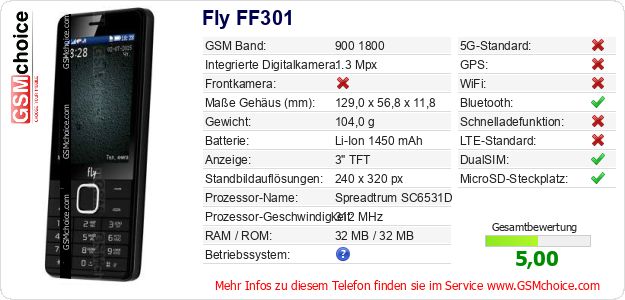 Hast du eigene Webseite? Willst du die Informationen über Standarddaten des Handys Fly FF301 irgendwo veröffentlichen? Das ist sehr einfach. Du kannst das Bild herunterladen oder kopieren und auf der Webseite folgenden Code hinzufügen:Das Einfügen von diesem Code verursacht das Anzeigen von dem folgenden Bild: