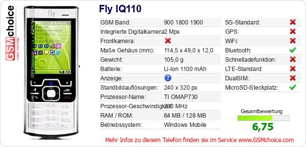 Hast du eigene Webseite? Willst du die Informationen über Standarddaten des Handys Fly IQ110 irgendwo veröffentlichen? Das ist sehr einfach. Du kannst das Bild herunterladen oder kopieren und auf der Webseite folgenden Code hinzufügen:Das Einfügen von diesem Code verursacht das Anzeigen von dem folgenden Bild: