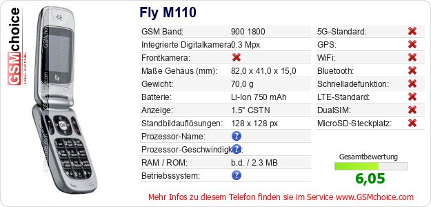 Hast du eigene Webseite? Willst du die Informationen über Standarddaten des Handys Fly M110 irgendwo veröffentlichen? Das ist sehr einfach. Du kannst das Bild herunterladen oder kopieren und auf der Webseite folgenden Code hinzufügen:Das Einfügen von diesem Code verursacht das Anzeigen von dem folgenden Bild: