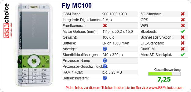 Hast du eigene Webseite? Willst du die Informationen über Standarddaten des Handys Fly MC100 irgendwo veröffentlichen? Das ist sehr einfach. Du kannst das Bild herunterladen oder kopieren und auf der Webseite folgenden Code hinzufügen:Das Einfügen von diesem Code verursacht das Anzeigen von dem folgenden Bild: