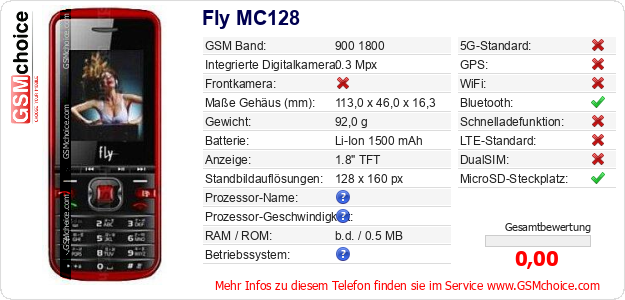 Hast du eigene Webseite? Willst du die Informationen über Standarddaten des Handys Fly MC128 irgendwo veröffentlichen? Das ist sehr einfach. Du kannst das Bild herunterladen oder kopieren und auf der Webseite folgenden Code hinzufügen:Das Einfügen von diesem Code verursacht das Anzeigen von dem folgenden Bild: