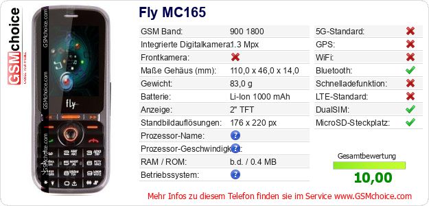 Hast du eigene Webseite? Willst du die Informationen über Standarddaten des Handys Fly MC165 irgendwo veröffentlichen? Das ist sehr einfach. Du kannst das Bild herunterladen oder kopieren und auf der Webseite folgenden Code hinzufügen:Das Einfügen von diesem Code verursacht das Anzeigen von dem folgenden Bild: