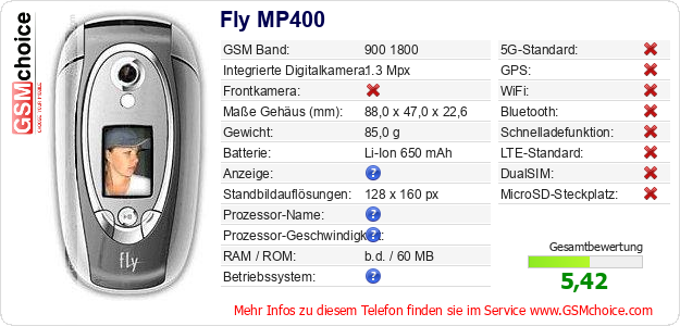 Hast du eigene Webseite? Willst du die Informationen über Standarddaten des Handys Fly MP400 irgendwo veröffentlichen? Das ist sehr einfach. Du kannst das Bild herunterladen oder kopieren und auf der Webseite folgenden Code hinzufügen:Das Einfügen von diesem Code verursacht das Anzeigen von dem folgenden Bild: