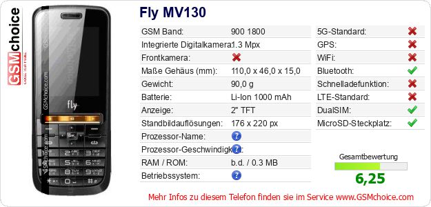 Hast du eigene Webseite? Willst du die Informationen über Standarddaten des Handys Fly MV130 irgendwo veröffentlichen? Das ist sehr einfach. Du kannst das Bild herunterladen oder kopieren und auf der Webseite folgenden Code hinzufügen:Das Einfügen von diesem Code verursacht das Anzeigen von dem folgenden Bild: