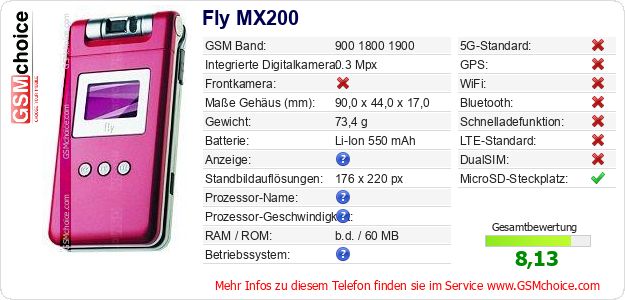 Hast du eigene Webseite? Willst du die Informationen über Standarddaten des Handys Fly MX200 irgendwo veröffentlichen? Das ist sehr einfach. Du kannst das Bild herunterladen oder kopieren und auf der Webseite folgenden Code hinzufügen:Das Einfügen von diesem Code verursacht das Anzeigen von dem folgenden Bild: