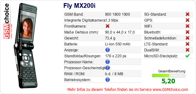 Hast du eigene Webseite? Willst du die Informationen über Standarddaten des Handys Fly MX200i irgendwo veröffentlichen? Das ist sehr einfach. Du kannst das Bild herunterladen oder kopieren und auf der Webseite folgenden Code hinzufügen:Das Einfügen von diesem Code verursacht das Anzeigen von dem folgenden Bild: