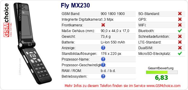 Hast du eigene Webseite? Willst du die Informationen über Standarddaten des Handys Fly MX230 irgendwo veröffentlichen? Das ist sehr einfach. Du kannst das Bild herunterladen oder kopieren und auf der Webseite folgenden Code hinzufügen:Das Einfügen von diesem Code verursacht das Anzeigen von dem folgenden Bild:
