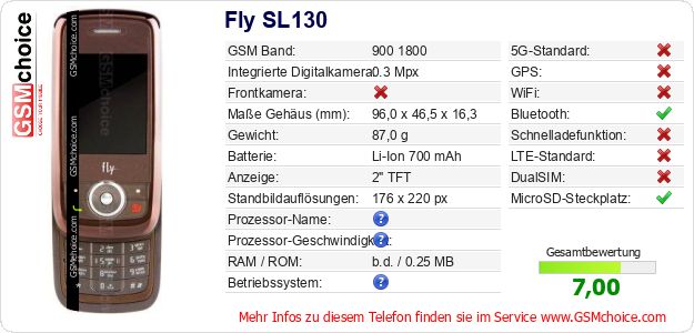 Hast du eigene Webseite? Willst du die Informationen über Standarddaten des Handys Fly SL130 irgendwo veröffentlichen? Das ist sehr einfach. Du kannst das Bild herunterladen oder kopieren und auf der Webseite folgenden Code hinzufügen:Das Einfügen von diesem Code verursacht das Anzeigen von dem folgenden Bild: