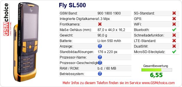 Hast du eigene Webseite? Willst du die Informationen über Standarddaten des Handys Fly SL500 irgendwo veröffentlichen? Das ist sehr einfach. Du kannst das Bild herunterladen oder kopieren und auf der Webseite folgenden Code hinzufügen:Das Einfügen von diesem Code verursacht das Anzeigen von dem folgenden Bild: