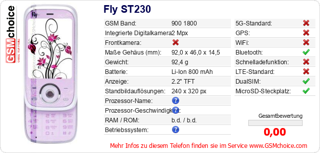 Hast du eigene Webseite? Willst du die Informationen über Standarddaten des Handys Fly ST230 irgendwo veröffentlichen? Das ist sehr einfach. Du kannst das Bild herunterladen oder kopieren und auf der Webseite folgenden Code hinzufügen:Das Einfügen von diesem Code verursacht das Anzeigen von dem folgenden Bild: