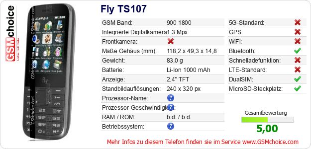 Hast du eigene Webseite? Willst du die Informationen über Standarddaten des Handys Fly TS107 irgendwo veröffentlichen? Das ist sehr einfach. Du kannst das Bild herunterladen oder kopieren und auf der Webseite folgenden Code hinzufügen:Das Einfügen von diesem Code verursacht das Anzeigen von dem folgenden Bild: