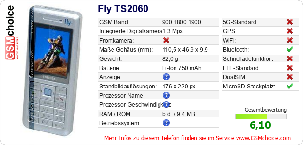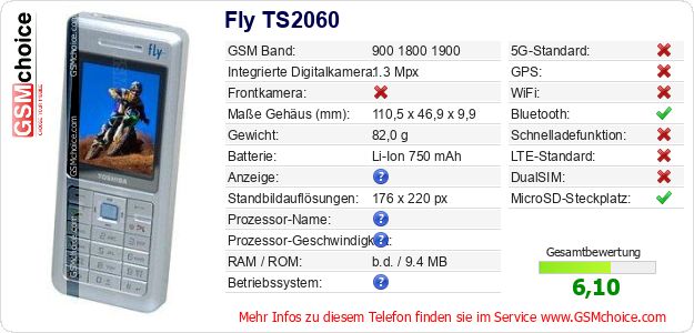 Hast du eigene Webseite? Willst du die Informationen über Standarddaten des Handys Fly TS2060 irgendwo veröffentlichen? Das ist sehr einfach. Du kannst das Bild herunterladen oder kopieren und auf der Webseite folgenden Code hinzufügen:Das Einfügen von diesem Code verursacht das Anzeigen von dem folgenden Bild: