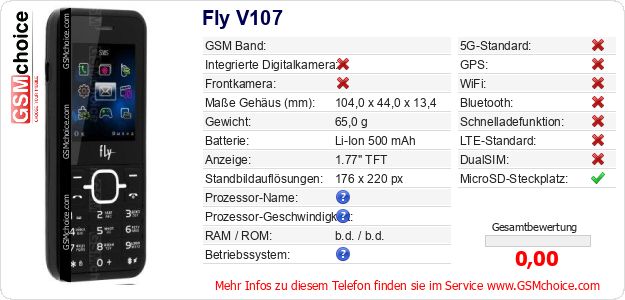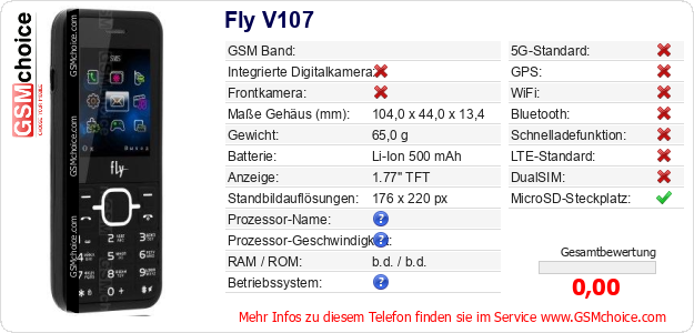 Hast du eigene Webseite? Willst du die Informationen über Standarddaten des Handys Fly V107 irgendwo veröffentlichen? Das ist sehr einfach. Du kannst das Bild herunterladen oder kopieren und auf der Webseite folgenden Code hinzufügen:Das Einfügen von diesem Code verursacht das Anzeigen von dem folgenden Bild: