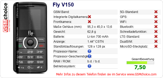 Hast du eigene Webseite? Willst du die Informationen über Standarddaten des Handys Fly V150 irgendwo veröffentlichen? Das ist sehr einfach. Du kannst das Bild herunterladen oder kopieren und auf der Webseite folgenden Code hinzufügen:Das Einfügen von diesem Code verursacht das Anzeigen von dem folgenden Bild: