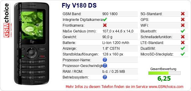 Hast du eigene Webseite? Willst du die Informationen über Standarddaten des Handys Fly V180 DS irgendwo veröffentlichen? Das ist sehr einfach. Du kannst das Bild herunterladen oder kopieren und auf der Webseite folgenden Code hinzufügen:Das Einfügen von diesem Code verursacht das Anzeigen von dem folgenden Bild: