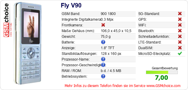 Hast du eigene Webseite? Willst du die Informationen über Standarddaten des Handys Fly V90 irgendwo veröffentlichen? Das ist sehr einfach. Du kannst das Bild herunterladen oder kopieren und auf der Webseite folgenden Code hinzufügen:Das Einfügen von diesem Code verursacht das Anzeigen von dem folgenden Bild: