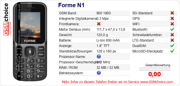Hast du eigene Webseite? Willst du die Informationen über Standarddaten des Handys Forme N1 irgendwo veröffentlichen? Das ist sehr einfach. Du kannst das Bild herunterladen oder kopieren und auf der Webseite folgenden Code hinzufügen:Das Einfügen von diesem Code verursacht das Anzeigen von dem folgenden Bild: