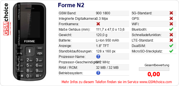 Hast du eigene Webseite? Willst du die Informationen über Standarddaten des Handys Forme N2 irgendwo veröffentlichen? Das ist sehr einfach. Du kannst das Bild herunterladen oder kopieren und auf der Webseite folgenden Code hinzufügen:Das Einfügen von diesem Code verursacht das Anzeigen von dem folgenden Bild: