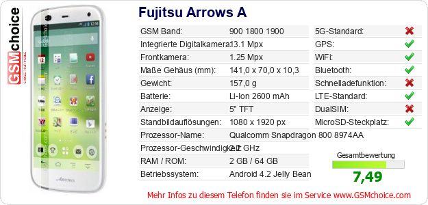 Hast du eigene Webseite? Willst du die Informationen über Standarddaten des Handys Fujitsu Arrows A irgendwo veröffentlichen? Das ist sehr einfach. Du kannst das Bild herunterladen oder kopieren und auf der Webseite folgenden Code hinzufügen:Das Einfügen von diesem Code verursacht das Anzeigen von dem folgenden Bild: