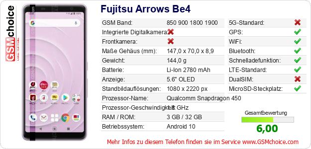 Hast du eigene Webseite? Willst du die Informationen über Standarddaten des Handys Fujitsu Arrows Be4 irgendwo veröffentlichen? Das ist sehr einfach. Du kannst das Bild herunterladen oder kopieren und auf der Webseite folgenden Code hinzufügen:Das Einfügen von diesem Code verursacht das Anzeigen von dem folgenden Bild: