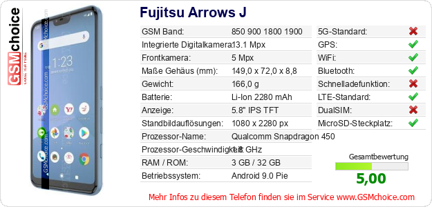 Hast du eigene Webseite? Willst du die Informationen über Standarddaten des Handys Fujitsu Arrows J irgendwo veröffentlichen? Das ist sehr einfach. Du kannst das Bild herunterladen oder kopieren und auf der Webseite folgenden Code hinzufügen:Das Einfügen von diesem Code verursacht das Anzeigen von dem folgenden Bild: