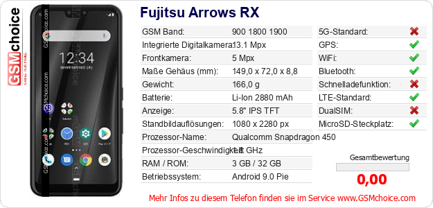 Hast du eigene Webseite? Willst du die Informationen über Standarddaten des Handys Fujitsu Arrows RX irgendwo veröffentlichen? Das ist sehr einfach. Du kannst das Bild herunterladen oder kopieren und auf der Webseite folgenden Code hinzufügen:Das Einfügen von diesem Code verursacht das Anzeigen von dem folgenden Bild: