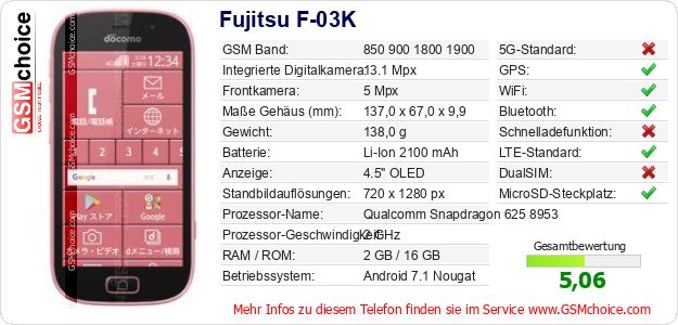 Hast du eigene Webseite? Willst du die Informationen über Standarddaten des Handys Fujitsu F-03K irgendwo veröffentlichen? Das ist sehr einfach. Du kannst das Bild herunterladen oder kopieren und auf der Webseite folgenden Code hinzufügen:Das Einfügen von diesem Code verursacht das Anzeigen von dem folgenden Bild: