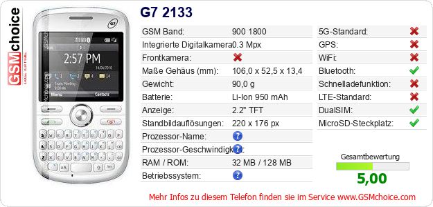 Hast du eigene Webseite? Willst du die Informationen über Standarddaten des Handys G7 2133 irgendwo veröffentlichen? Das ist sehr einfach. Du kannst das Bild herunterladen oder kopieren und auf der Webseite folgenden Code hinzufügen:Das Einfügen von diesem Code verursacht das Anzeigen von dem folgenden Bild: