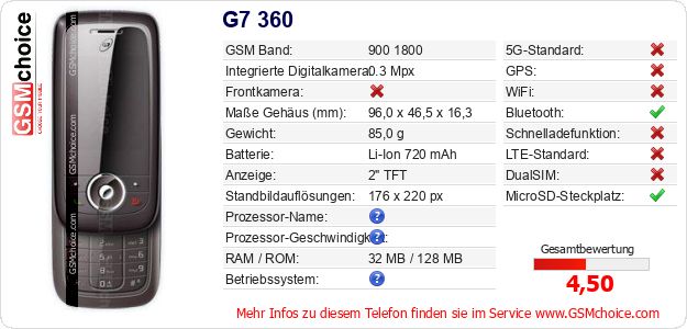 Hast du eigene Webseite? Willst du die Informationen über Standarddaten des Handys G7 360 irgendwo veröffentlichen? Das ist sehr einfach. Du kannst das Bild herunterladen oder kopieren und auf der Webseite folgenden Code hinzufügen:Das Einfügen von diesem Code verursacht das Anzeigen von dem folgenden Bild: