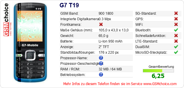Hast du eigene Webseite? Willst du die Informationen über Standarddaten des Handys G7 T19 irgendwo veröffentlichen? Das ist sehr einfach. Du kannst das Bild herunterladen oder kopieren und auf der Webseite folgenden Code hinzufügen:Das Einfügen von diesem Code verursacht das Anzeigen von dem folgenden Bild: