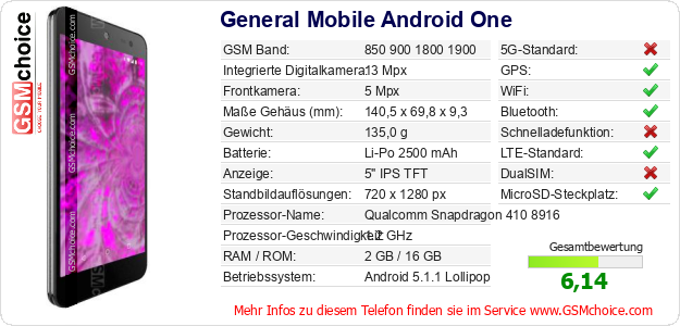 Hast du eigene Webseite? Willst du die Informationen über Standarddaten des Handys General Mobile Android One irgendwo veröffentlichen? Das ist sehr einfach. Du kannst das Bild herunterladen oder kopieren und auf der Webseite folgenden Code hinzufügen:Das Einfügen von diesem Code verursacht das Anzeigen von dem folgenden Bild: