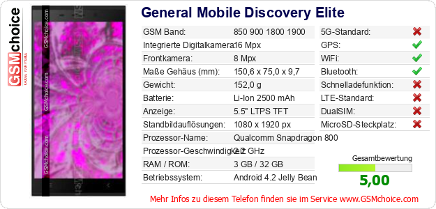 Hast du eigene Webseite? Willst du die Informationen über Standarddaten des Handys General Mobile Discovery Elite irgendwo veröffentlichen? Das ist sehr einfach. Du kannst das Bild herunterladen oder kopieren und auf der Webseite folgenden Code hinzufügen:Das Einfügen von diesem Code verursacht das Anzeigen von dem folgenden Bild:
