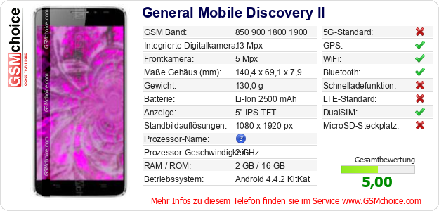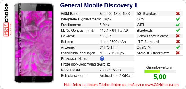 Hast du eigene Webseite? Willst du die Informationen über Standarddaten des Handys General Mobile Discovery II irgendwo veröffentlichen? Das ist sehr einfach. Du kannst das Bild herunterladen oder kopieren und auf der Webseite folgenden Code hinzufügen:Das Einfügen von diesem Code verursacht das Anzeigen von dem folgenden Bild: