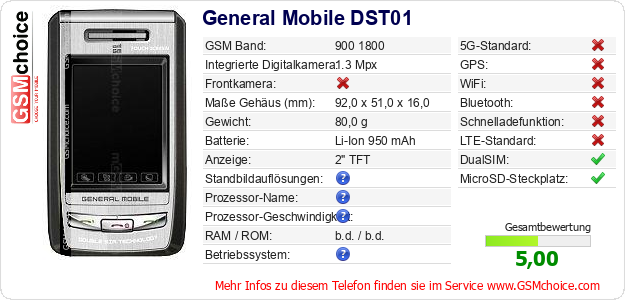 Hast du eigene Webseite? Willst du die Informationen über Standarddaten des Handys General Mobile DST01 irgendwo veröffentlichen? Das ist sehr einfach. Du kannst das Bild herunterladen oder kopieren und auf der Webseite folgenden Code hinzufügen:Das Einfügen von diesem Code verursacht das Anzeigen von dem folgenden Bild: