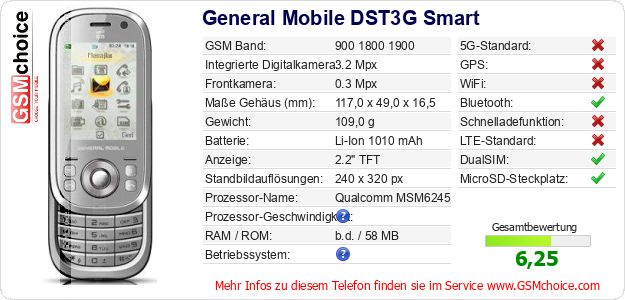 Hast du eigene Webseite? Willst du die Informationen über Standarddaten des Handys General Mobile DST3G Smart irgendwo veröffentlichen? Das ist sehr einfach. Du kannst das Bild herunterladen oder kopieren und auf der Webseite folgenden Code hinzufügen:Das Einfügen von diesem Code verursacht das Anzeigen von dem folgenden Bild: